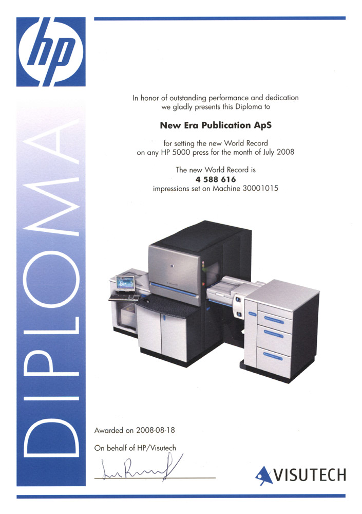 Hewlett Packard, also known as HP, is a multinational American company founded in 1935, and one of the world’s largest providers of information technology equipment and applications solutions. HP specializes in developing and manufacturing all forms of digital hardware, including a diverse range of digital printers and imaging products. Records are maintained throughout Europe and the world for the number of impressions produced on a given printing machine, and customers exceeding the world record are acknowledged by both Hewlett Packard and its distributor, Visutech, with a diploma honoring the achievement.